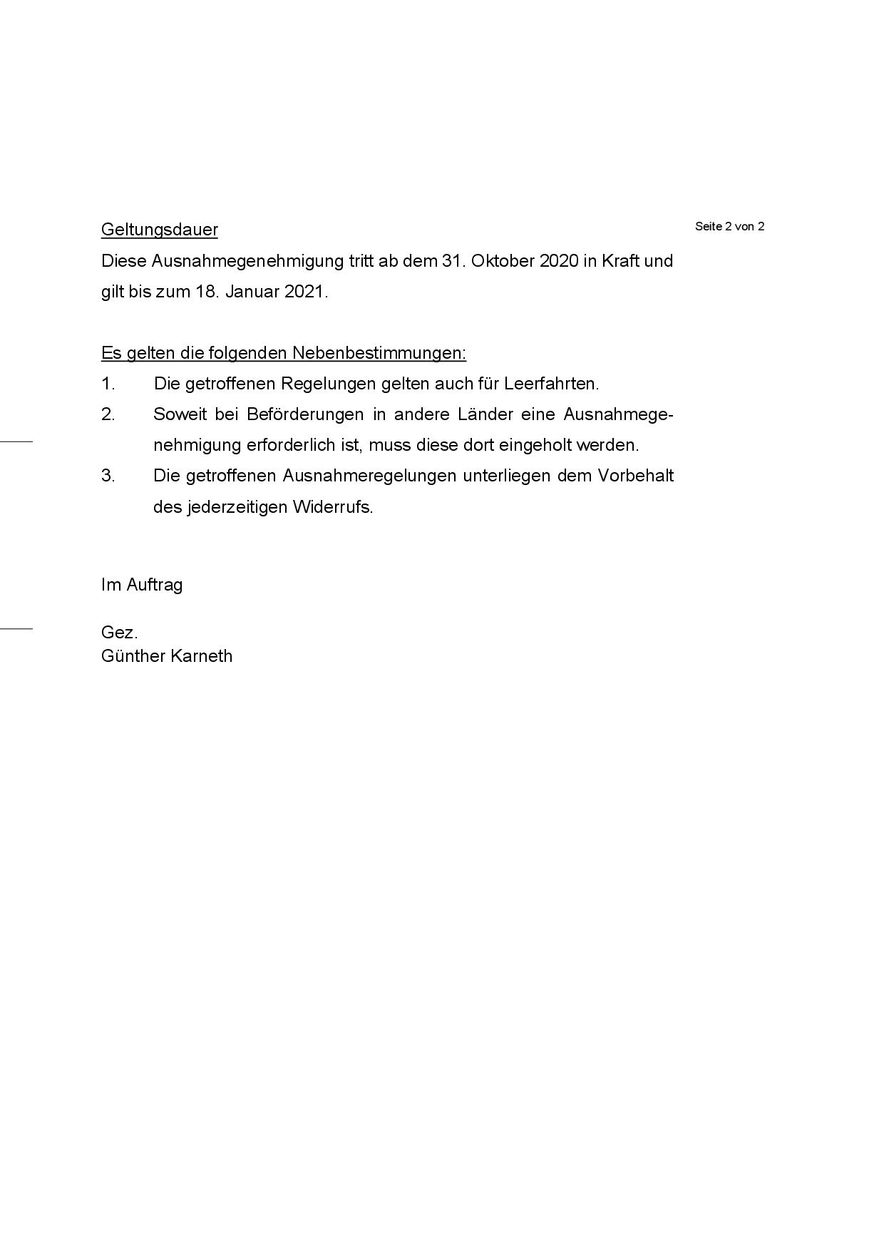 Exención general de la prohibición de conducir en domingos y festivos desde el 31.10.2020 hasta el 18.01.2021. No se aplica a cargas que superen los pesos y medidas máximas.