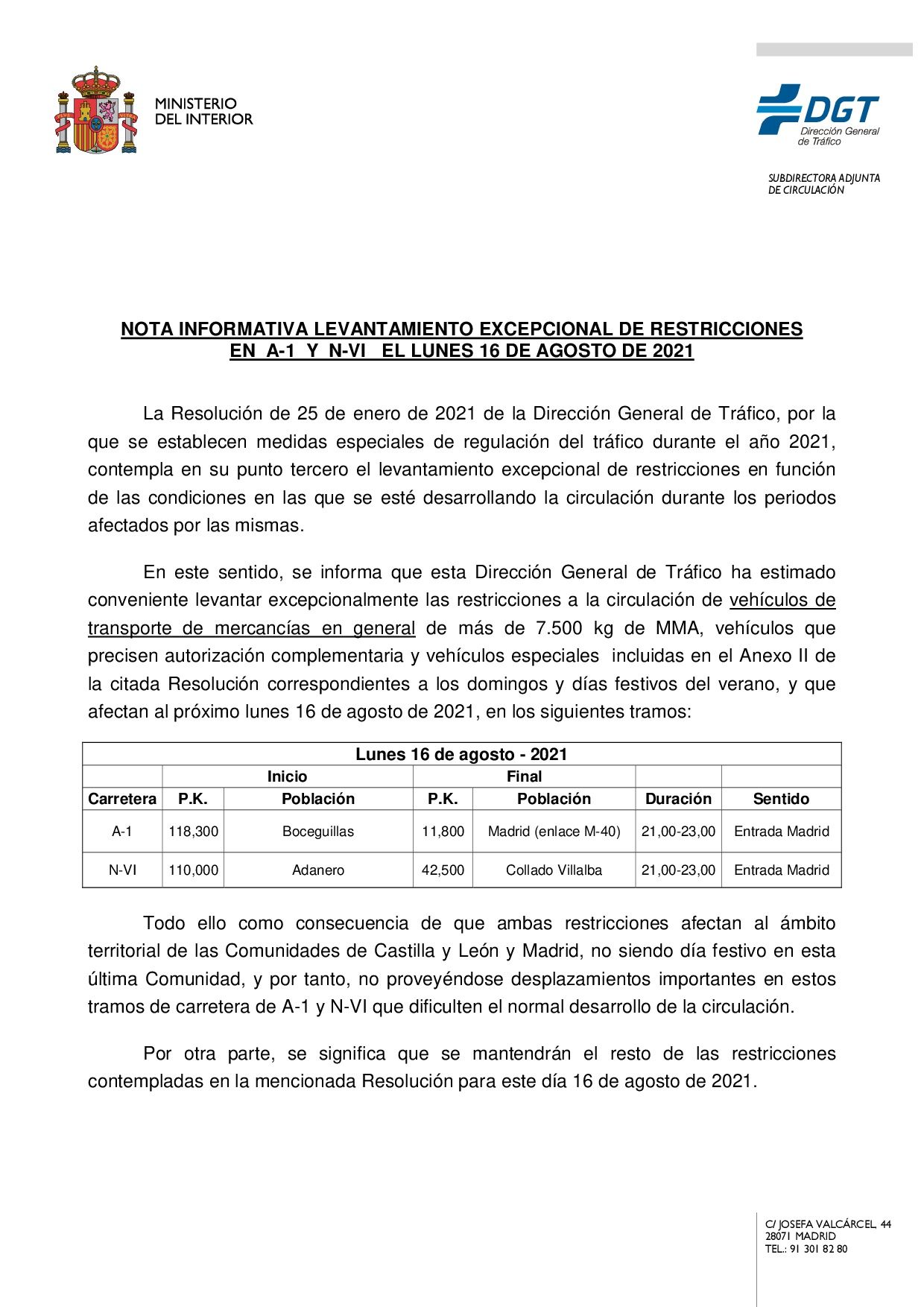 Se traslada Nota informativa indicando el levantamiento de  las restricciones a la circulación de vehículos de más de 7.500 kg de MMA, vehículos que precisen autorización complementaria y vehículos especiales contempladas en el Anexo II de la Resolución que les fueran de aplicación durante el próximo lunes 16 de agosto en los siguientes tramos.