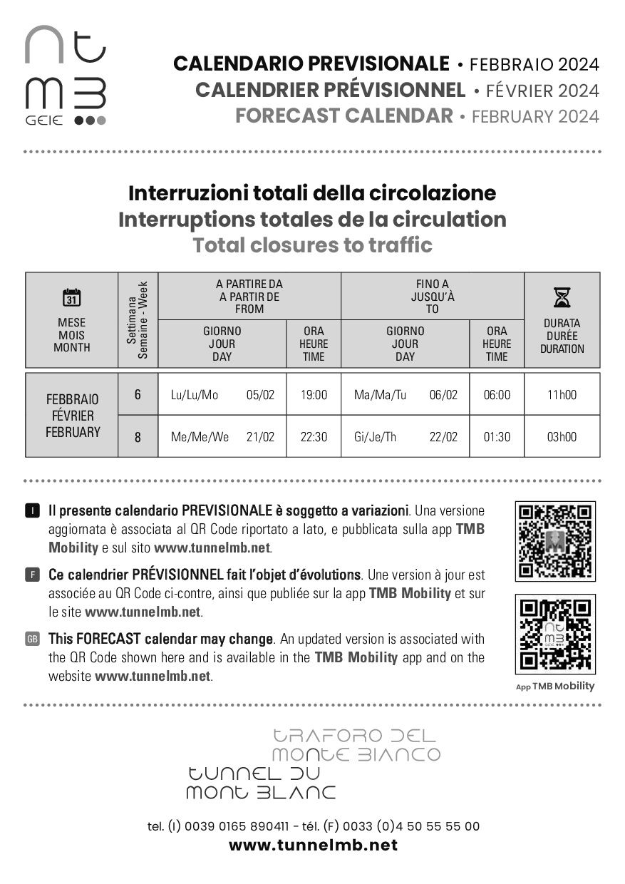 Para permitir la realización de las obras de mantenimiento, la circulación quedará totalmente interrumpida en el túnel del Mont Blanc durante la noche: