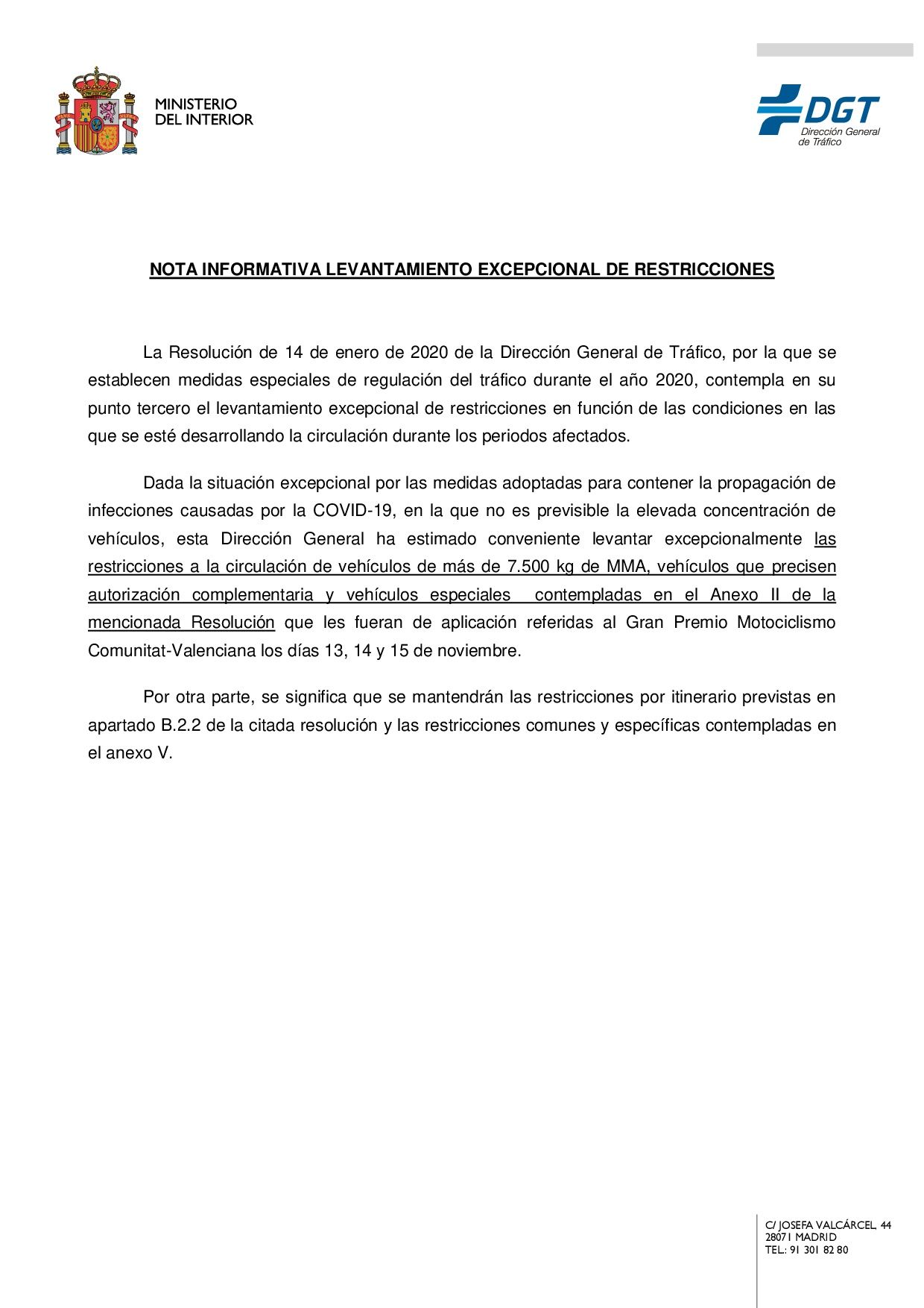 Se adjunta nota informativa emitida por la Dirección General de Tráfico sobre levantamiento excepcional de las restricciones los días 13, 14 y 15 de noviembre, referidas a la celebración del Gran Premio Motociclismo Comunitat-Valenciana.