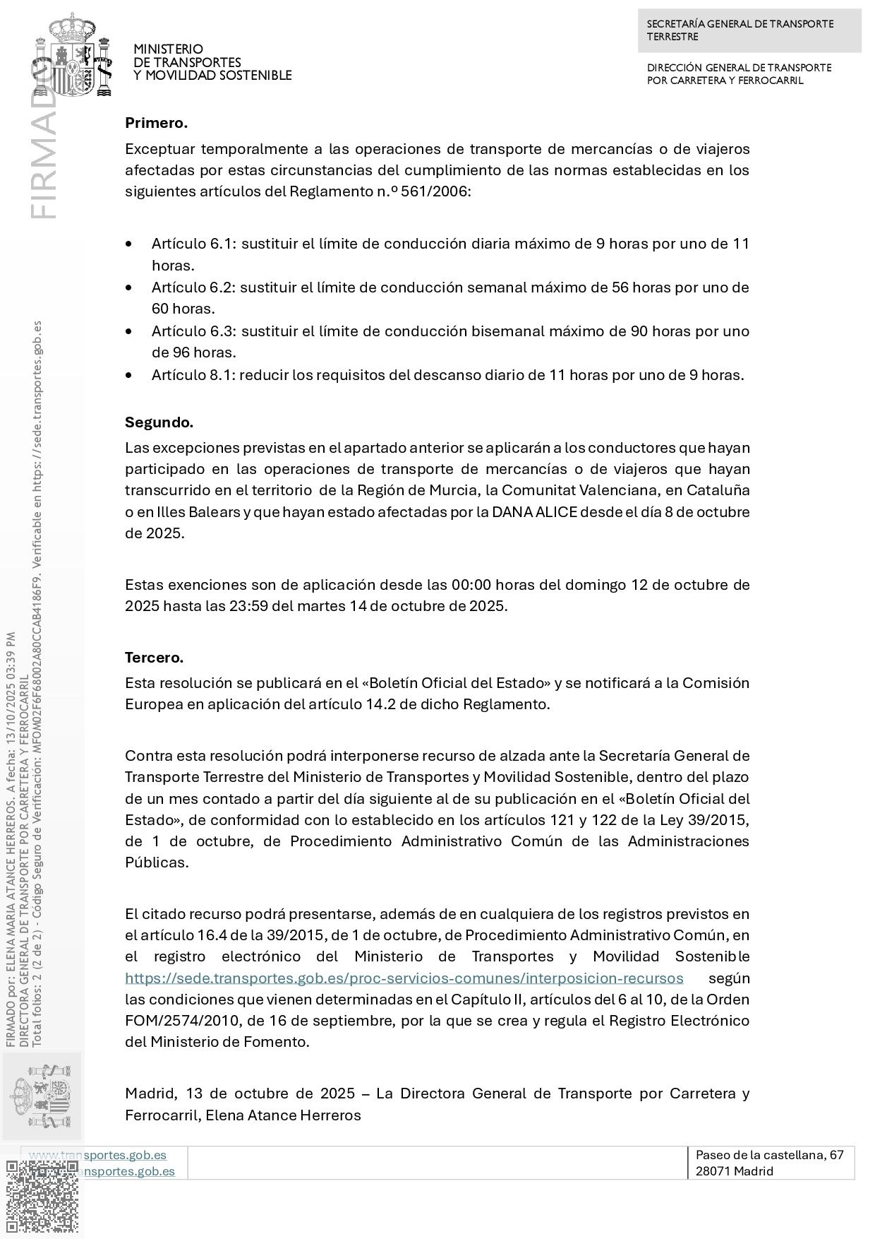 Como consecuencia de las lluvias de los últimos días en algunas zonas de España, se ha detectado la necesidad de exceptuar temporalmente algunas de las limitaciones a los tiempos de actividad establecidas en el Reglamento (CE) n.º 561/2006.