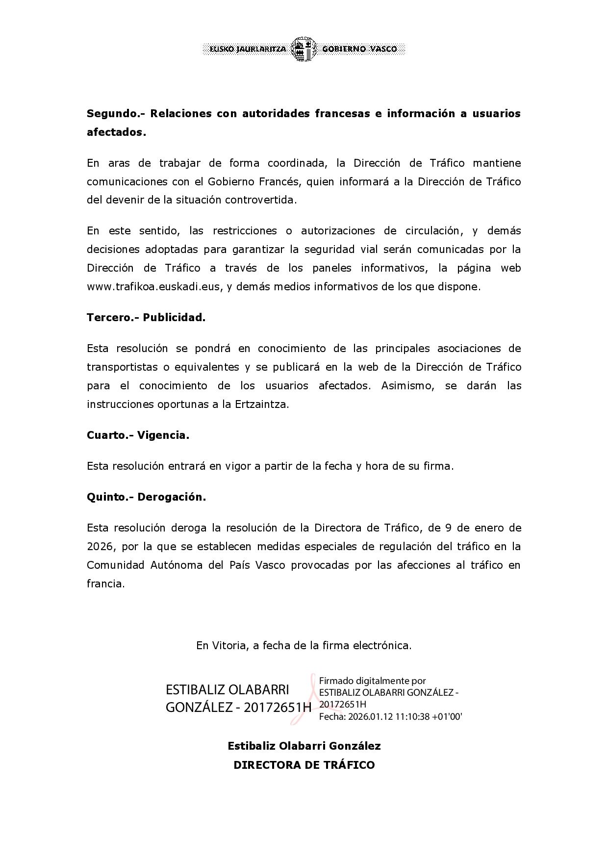 Adjuntamos Resolución de Tráfico del País Vasco por la cual se dejan sin efecto las restricciones a camiones en el País Vasco.