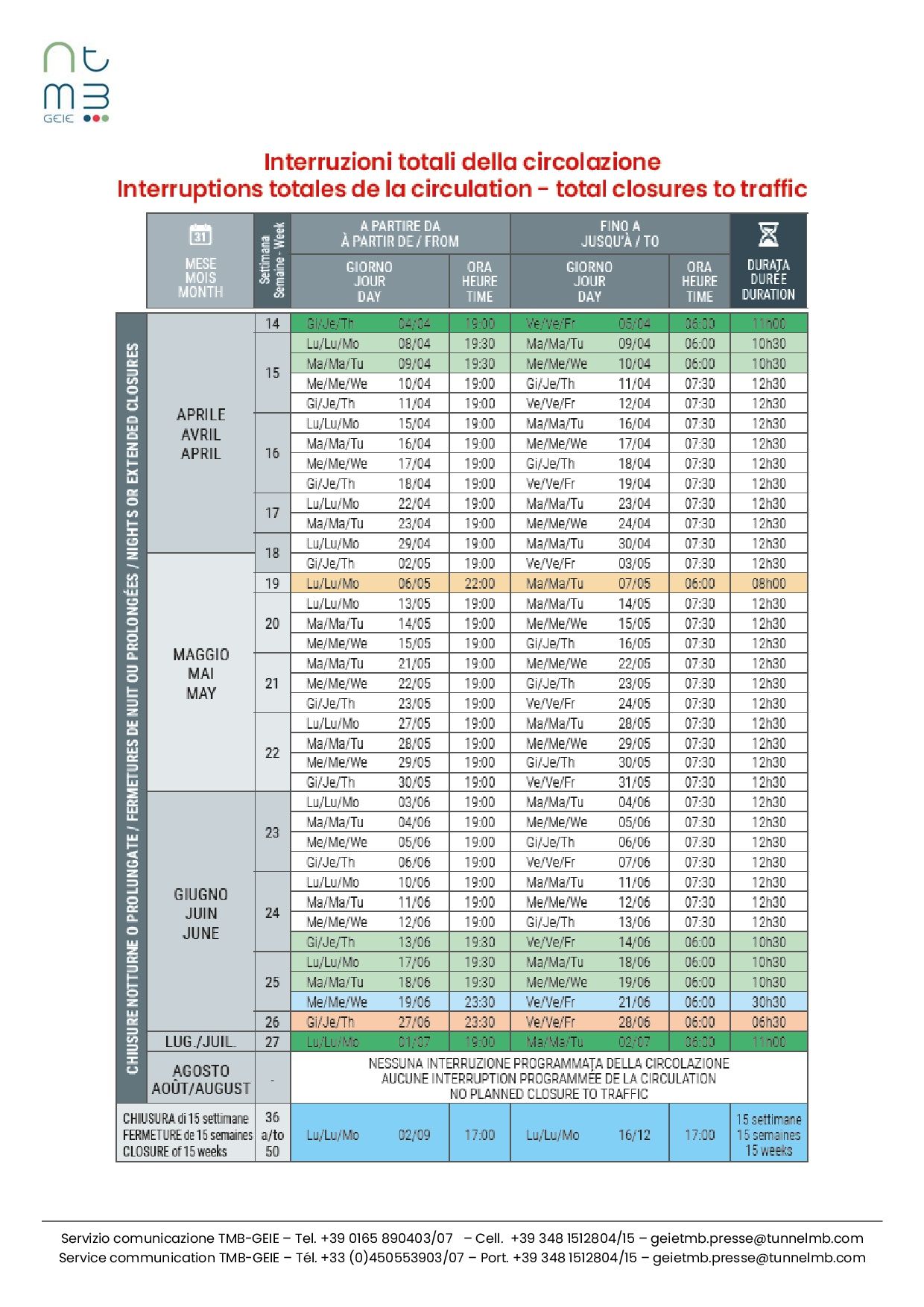 La reconstrucción completa de dos tramos de la bóveda del túnel de 300 metros cada uno se reprogramó para 2024. Estas actividades requerirán el cierre total del túnel del Mont Blanc durante 15 semanas, del 2 de septiembre (17:00h) al 16 de diciembre (17:00h).
