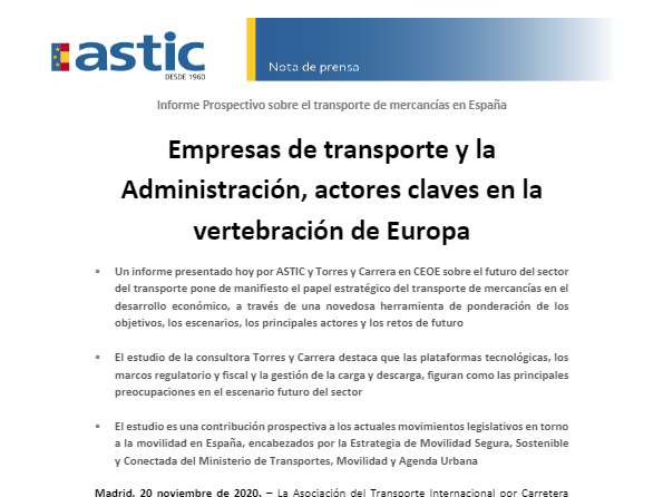 ASTIC subraya carácter estratégico empresas transporte carretera para reconstrucción económica España