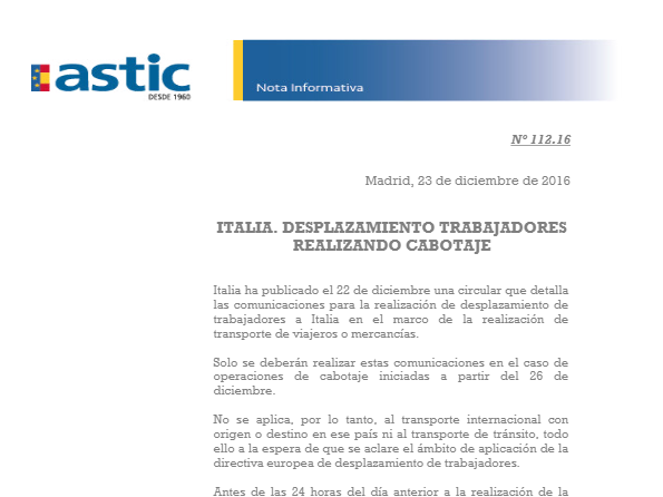 N.I. 112.16. Italia. Desplazamiento trabajadores